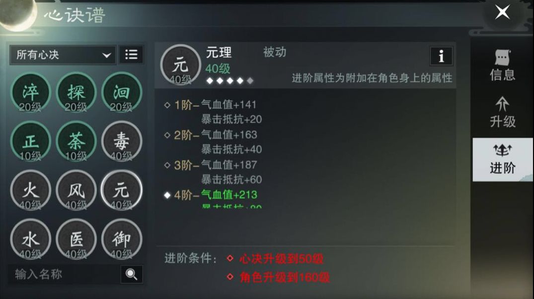 而心决谱进阶属性有加坚韧,防爆,格挡,命中,攻击,优先升级进阶有加坚韧属性的心决,以后再根据自己的面板选择其它属性~