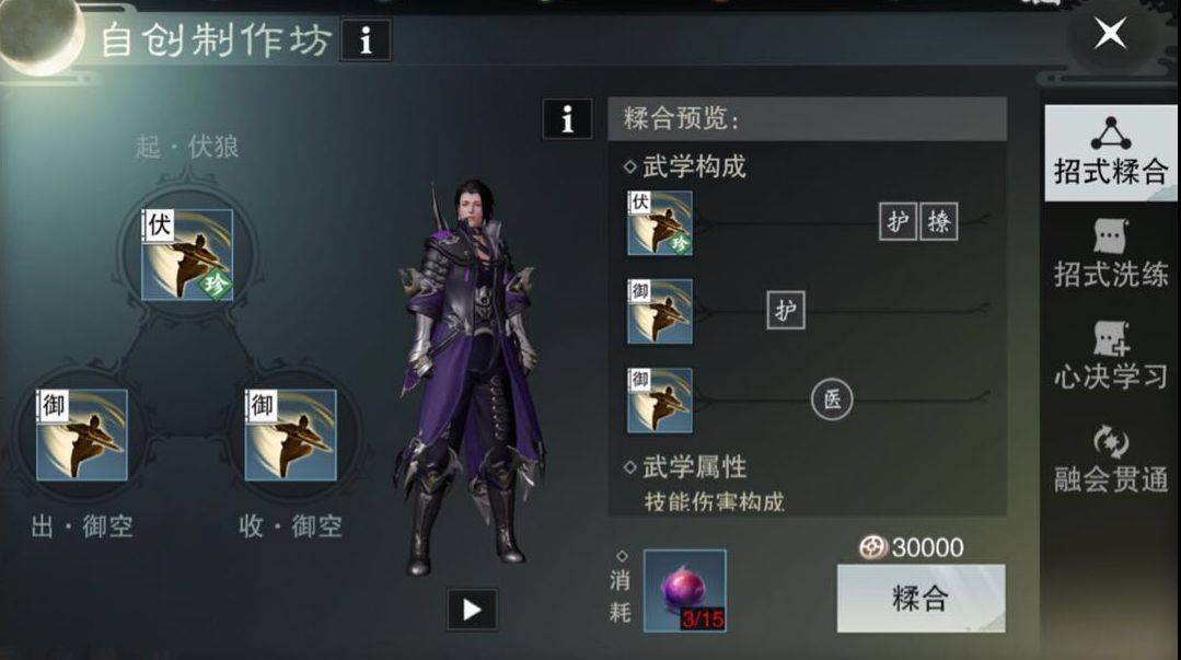 ps:糅合武学需要15个醍醐灵丹(商城出售),或者在摆摊处买招式分解后获得