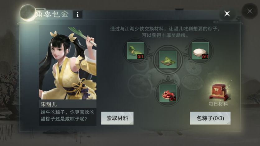 少侠们每天都能从 角黍包金的 活动页面中领取礼盒 或 完成日常任务 就能拿到包粽子的食材啦!