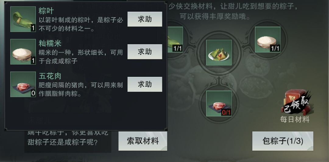 刚要包粽子的时候才发现:材料不够,咋办? 不方,我们还可以从 帮派 、 门派 频道 上向朋友们求助 获得帮助后别忘了说声谢谢哦~