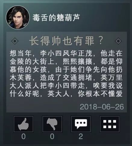 发完这两个故事,我美滋滋地等待大家的回复~没想到……等了好久,竟然没人理我??过了一会,有人回复到: 据我所知,李小四没谈过恋爱吧……香帅比李小四大了好几岁根本不一致,别瞎编了!