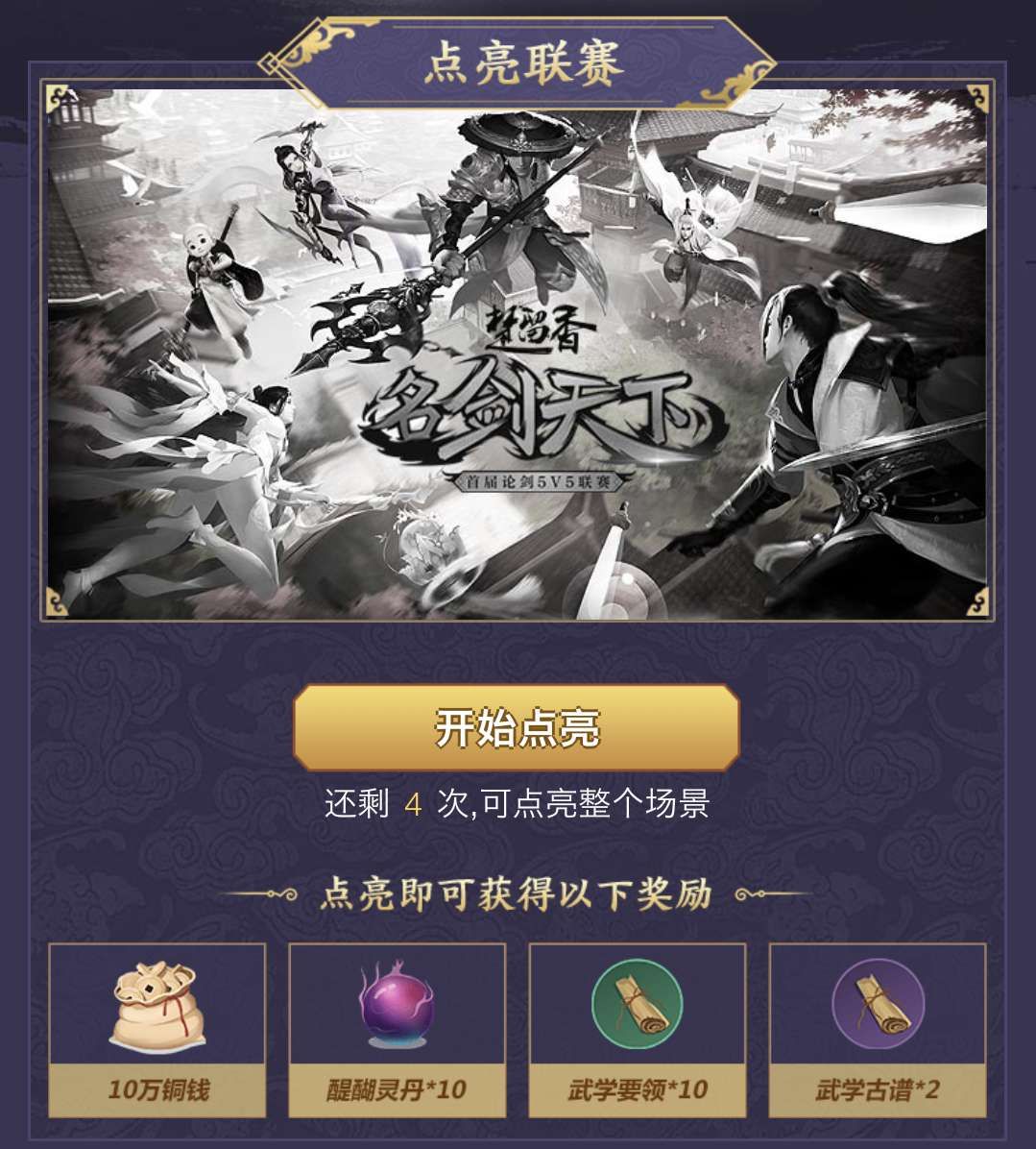 点击“ 开始点亮 ”并把“ 点亮联赛 ”活动分享给小伙伴即可点亮一片场景。成功分享 4个不同的好友 ,即可点亮全部场景,就能获得丰厚的游戏礼包!