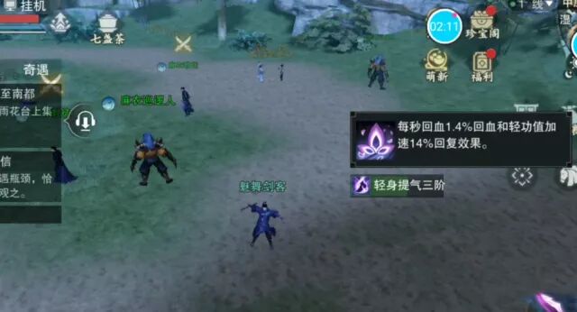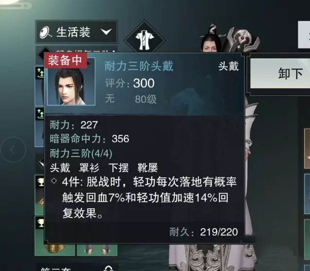 ✦ 套装属性 : 脱战落地时, 有概率回血 和 增强轻功值 的回复速度。