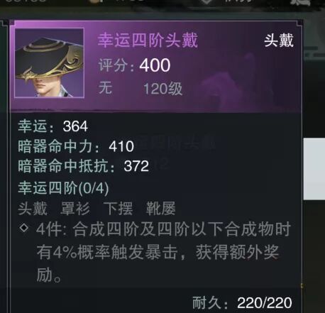 这个幸运套的触发几率理论上和体力套是一样的,但是我测试的时候整体低一些,不知是否是合成暗器的原因。