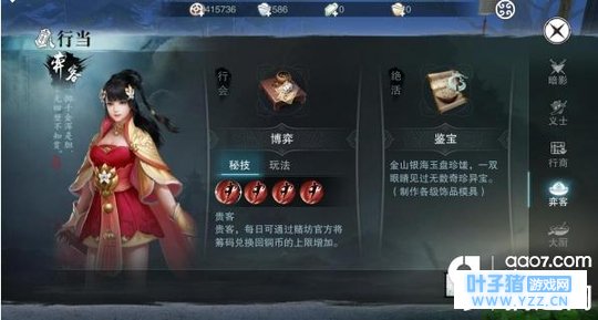四.弈客 赌神~可以将铜币换为筹码然后组队发起赌博赌博是需要队伍内的人插旗单挑产生的伤害值作为大小.1-5小6-10大.还有在博弈多人玩法中出老千重新滚动骰子并且可以去赌场向NPC借筹码!!!绝活可以制作出30-130级的饰品制作图.