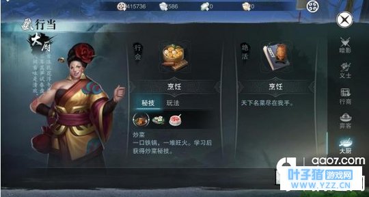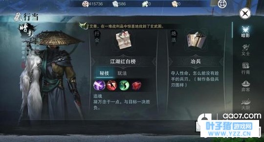 一.暗影 暗影属于刺客所有玩家可以发起悬赏令让暗影去完成刺杀任务.悬赏令分为两种白磅和红榜.白磅为刺杀NPC获得奖励.红榜需要发起者支付相应的银元才能发起.按照等级分为人地天级别。杀害过你的人可以添加为仇人后发起红榜 只要你足够实力就能获得一笔不错的收入.绝活是可以做出武器和副手制作图60级-130级