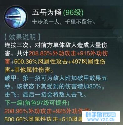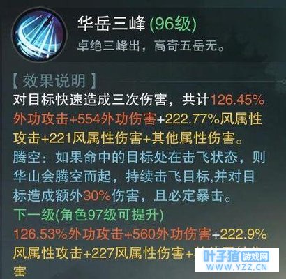 华岳三峰:华山连招中的核心,配合击飞直接秒人的那种,这个技能CD很长,记住不要随便释放!