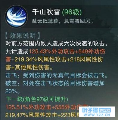 千山吹雪:在对面没有真气的时候释放,直接挑飞,这就为很多华山玩家不知道怎么挑飞的问题,记住,这个技能只有在对方没有真气的情况才能击飞,白色真气条就在血条下面。