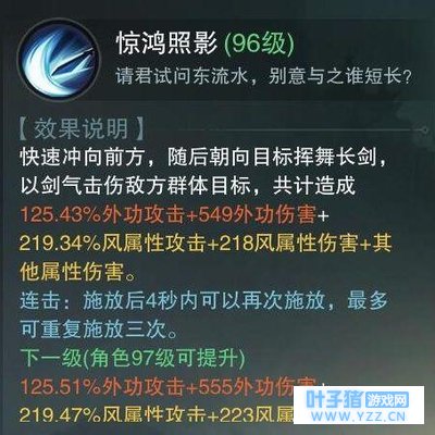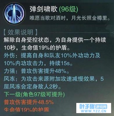 弹剑啸歌:华山的核心技能,打本能提升队友攻击。pk能解控能上盾,PK的时候慎用;