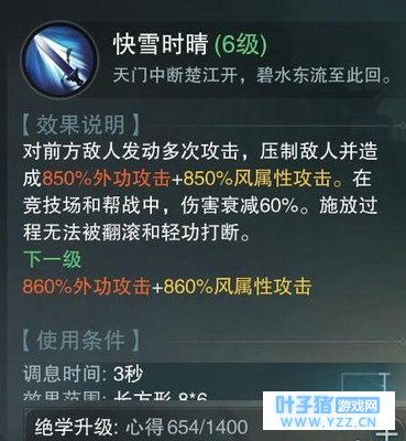 快雪时晴:非常牛一个绝学技能,也是非常挫的一个技能。大招前两次直接可以群体挑飞,空中持续攻击不掉下来。绝学需要靠技能和普攻积攒满怒气释放,华山的高爆发注定不会打很久,反正我打那么多场论剑,基本没用出来过,基本也就是打本和多人战场的时候能用出。