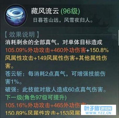 藏风流云:华山的吹风,技能核心中的核心,伤人一千自损八百的技能,由于释放会清空所有真气,所以要非常考虑释放的时机,也是连招必备技能之一。