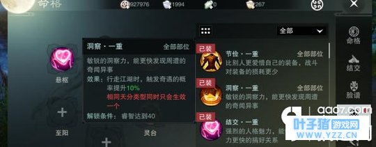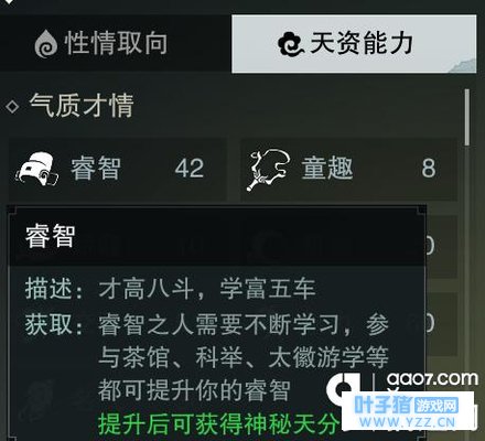 1.命格-天分-洞察 该天分可以提高触发奇遇的几率,需要睿智40点激活一重加10%几率。至于睿智如何提升在天资能力里点开可以看到,茶馆,科举,太微游学答题活动以及主线任务。太微游学就是满地图会看到一个书生,头顶有绿色日常任务标志,每日可以答题,一次2题,答完后同一个npc需要过一会才能继续作答。日常活动玩法贴再详细介绍。