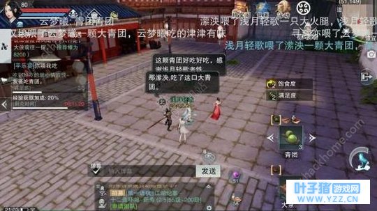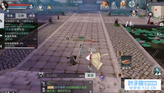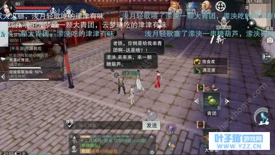 这么一个和谐吃饭的场所 当然是没有办法用技能的啦~ 这时候就祭出了茶壶攻击 怼他 打他 丢他 在江湖任务内有每个人所需要的食物 分别是青团、鸡腿、糖葫芦 还会有一个神奇的物品 泻药! 谋财害命之必备~(开玩笑的XD)