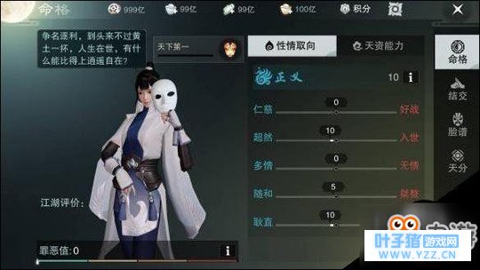 然后便是命格了,命格的入口在主界面小地图下方有朵花的标记,在打开菜单后选择命格即可进入,从这里我们可以看到命格是有多种选项的,好战,仁慈,超然等等,且上面有一组数据,随着数字的倾向来决定你的人物性格 很家比较好奇的是人物性格的这组数字是如何变动的,这影响的因素很多,比如玩家在游戏中做出的选项答案,或是在游戏中滥杀无辜,都会影响这组数据,所以大家在选择的时候可以随性选,但如果一开始就有目标的话,就要谨慎了。