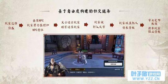 最终的经历,会写在脸上 这些对游戏高自由度的探索创新,在以往的武侠MMORPG游戏中非常少见,尤其在剧情和玩法上的高度自由开放,对开发组的游戏节奏把控能力要求相当高。不过这种高自由度武侠世界一旦实现,无疑会给游戏带来旺盛的长线生命力和极高的活跃度。 另一点需要指出的是,《楚留香》手游在玩法操作上的社交植入也是它在武侠MMORPG玩法模式的一大亮点。单单在PVP方面,游戏就提供了多种的竞技场、战场等固定环境下的PVP玩法,同时将帮会、行当等强社交的因素整合进PVP玩法里。增强游戏中人与人社交的黏性,加深玩家间的羁绊,强化玩家间的江湖代入感。而这些都将让《楚留香》手游在日后的长线运营上走得更久更稳。 举个栗子:在游戏中偷一个西瓜会怎样? 在这次分享中,主创人员现场推演了在《楚留香》里偷一个西瓜,会发生什么? 在游戏中,玩家随时可能接到一个神秘的势力任务,完成该任务需要一个西瓜道具。西瓜其实可以从两种途径获得,一种是直接购买,造价非常高昂。 但是,我们游戏很多东西都是具备环境交互属性的。所以,玩家可以直接采集摊贩旁边的西瓜,其实也就是偷瓜,此时摊贩就会发怒攻击玩家,玩家可以击杀NPC,增加罪恶值,同时NPC会发布悬赏,从而也就触发了玩家与玩家的交互行为:义士行当的玩家会缉拿具有罪恶值的玩家,暗影行当玩家会来追杀悬红榜上的玩家,一次多重交互的可能就此产生。 产生后续的结果,玩家被义士击杀后进入天牢,劫狱这个高自由度玩法进一步催化社交。 玩家选择各种方式逃离天牢,比如做苦力,讨好牢头,送礼,其中性价比最高的方式是邀请几个其他玩家前来营救,可从好友、帮派或是世界上发布求救邀请,实现一次陌生人+熟人的多重交互。 而牢头NPC则会在世界里发布公告,邀请各路玩家前来相助,阻止劫狱,仇人也可以趁机有怨报怨有仇报仇,又一次多重的交互产生,进而将一个普通的PVE玩法导向PVP内容,最终导向多次多重关系的玩家交互。