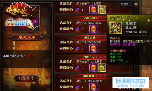 漫漫江湖路,杀戮不间断,成就也在慢慢累积。当玩家在ppwan《楚留香新传》中击杀100名玩家之后,完成连斩百人的成就,就能获得“连斩百人”的称号,此称号不仅可以威震江湖,还可以为玩家带来包括攻击、防御等在内的多项属性。