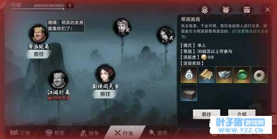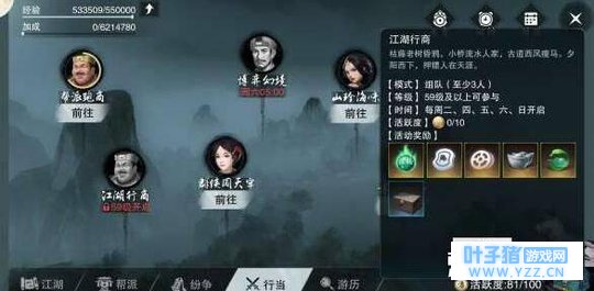江湖行商玩法:行商作为队长组成至少三人的小队。从江南豪商邛库命处领取开始。玩家需要利用本金50000,前往江南、少林、华山、暗香、武当各处的商人处低买高卖赚至20000即可返回上缴领取奖励。一旦货车中额度超过200000就只能出售货物无法再行买入。沿途有概率遇到打劫的土匪和劫车的玩家,大侠小心了。玩法开启当日玩家前两次可直接获得行商奖励,两次以后只能获得分成额度的商票,商票可上缴至帮派增加帮派资金获取帮贡。