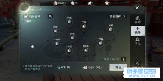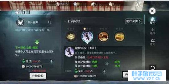 秘技介绍: 铜钱眼:查看选中行商、跑商商品最佳购买及出售地点(可在对应道具详情中使用);技能等级提升可以增加同时查看商品个数。 破财消灾:跪下磕头,愿奉上财物请好汉高抬贵手,这个技能可在江湖行商中遇到打劫时使用;技能等级提升可以增加延续时间和缩短冷却。 鬼推磨:江湖行商中使马车加速百分之十;技能升级可增加提速。 打包袱:发起帮派跑商或江湖行商时增加行囊2格;技能升级可增加格数。 2.行当绝活 和其他行当身份一样,行商的绝活是制作下装的修理图纸和打造图纸,需要见识点来升级,见识点来源于各种行当日常任务。