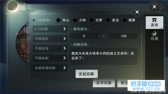 在《楚留香》结义系统中,玩家可以自定义条件发布结义招募,配上一句血性十足的招募语,天下英雄一呼百应。 别以为结义只是喊喊口号,不说歃血而盟,起码也要有个仪式感。结义成功后可在华山脚下种下专属结义树。记得每天来浇浇水,队伍中每人都可以到结义树领取信物,有时候还能开出丰厚奖励。