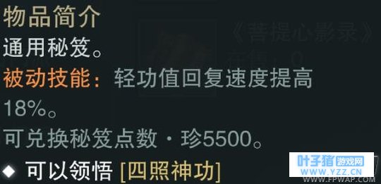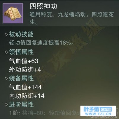 通用秘笈 被动技能:轻功值回复速度提高18% 领悟属性:气血值+63、内功防御+4 装备属性:气血值+144、外功防御+14