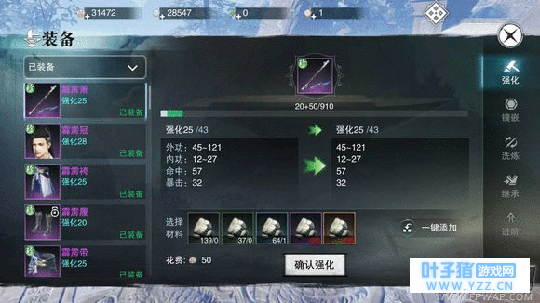 楚留香装备的提升较为复杂,我分条讲述下,第一个就是强化,强化上限和装备的等级跟品质有关,强化需要强化石,石头共有五种,无法通过购买获得,只能通过日常和副本产出,强化值满即+1