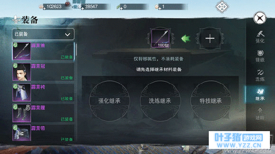 装备的强化,宝石,洗练,特技均可以花费少量铜币进行继承