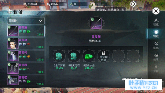 然后是镶嵌,现在装备最多可以镶嵌3个宝石,第三个孔需要装备强化到20级才会打开,宝石可以合成,2个合成一个更高级的,宝石提升战力最快的两个方式之一。