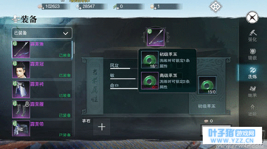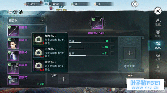 接下来是洗练,洗练提升修为(修为并不完全等于实力,因为有虚战的存在)最快的方式,洗练会在所有属性中随机选择,并且每次条数随机,洗练石品质只影响上限,也就是说哪怕紫色的洗练石也可能只会洗出一条属性