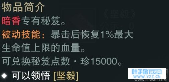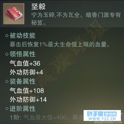 暗香专有秘笈 被动技能:暴击后恢复1%最大生命值上限的血量 领悟属性:气血值+36、内功防御+4 装备属性:气血值+108、内功防御+14