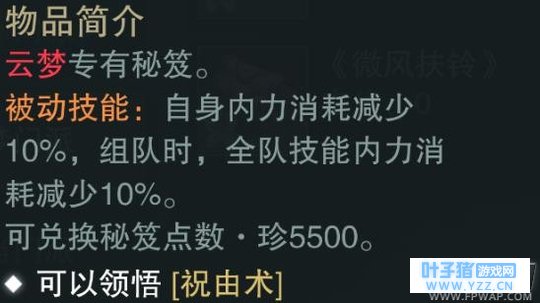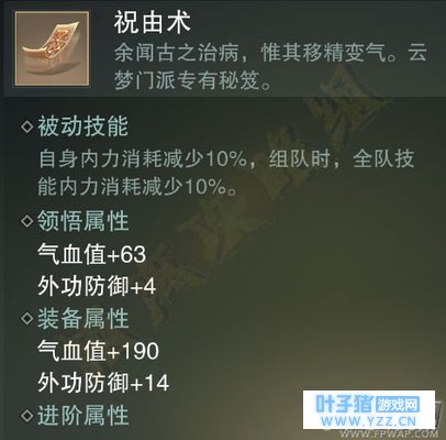 云梦专有秘笈 被动技能:自身内力消耗减少10%,组队时,全队技能内力消耗减少10% 领悟属性:气血值+63、内功防御+4 装备属性:气血值+190、内功防御+14