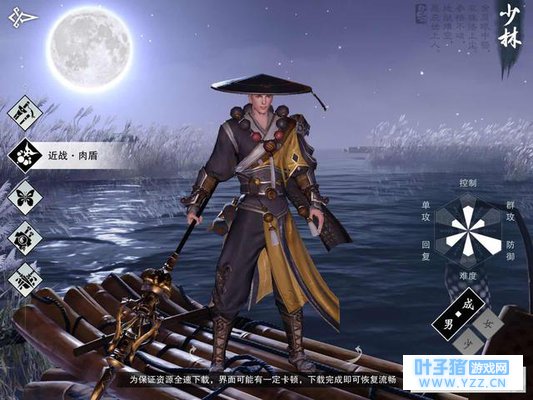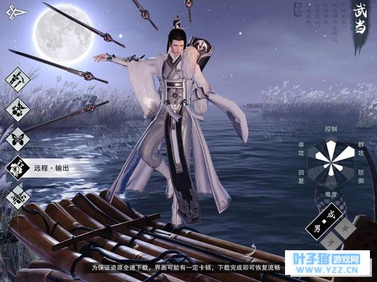 开头动画过后,便是选择门派和性别:华山(类似战士)、少林(类似坦克)、武当(类似ADC)、云梦(类似法师、辅助)、暗香(类似刺客)。 武当派英姿飒爽。