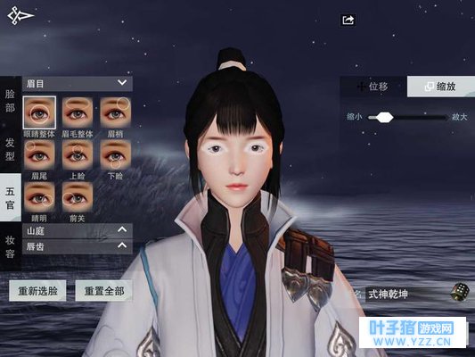 捏脸系统的精细度和可调整空间让人惊叹,下面举个例子:“五官”的“眉目”选项中,我们可以对“眼睛整体”进行调整,既可调整眼睛在脸部的上下位置和宽度,又可对眼睛的大小缩放进行调整。