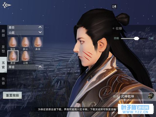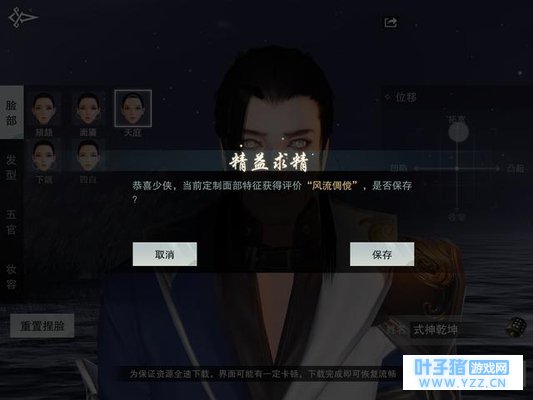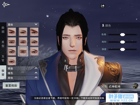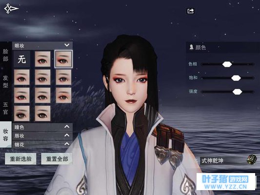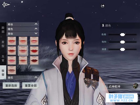 然后我们可以对脸部、发型、五官、妆容四个大项进行调整,其中每个大项中又设置了若干细项,比如对“脸部”中的下巴,“五官”中的眼睛,妆容中的眼妆、瞳色等等进行各种“微整形”,再配合发型、钿花等,可创建出千变万化角色形象,尽情塑造你心中最理想的侠客造型。