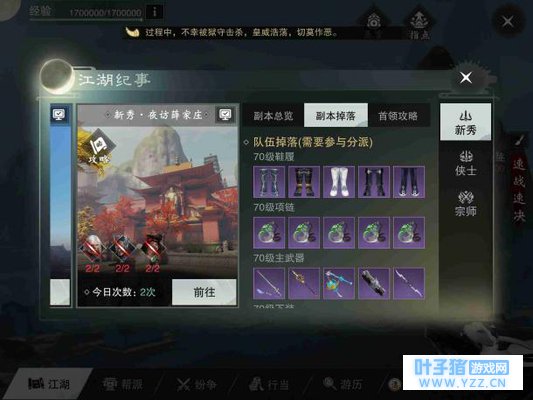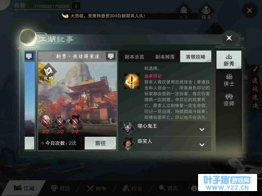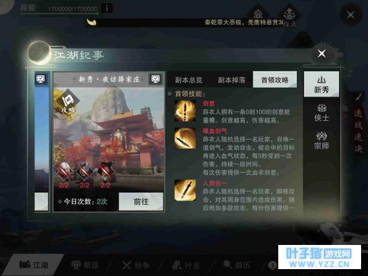 新秀·薛家庄会掉落各门派的70级紫色装备,该装备以后可以一直升级用下去,也有不能上升级的血玲珑套装,这个装备只在前期有一定价值,毕竟它不能升级,分解会给一块4级源石,有的极品装备只能在集市出售,买的人会很少,这时候就不如分解,分解极品装备给源石的同时还会分解出“明月光”,这个材料以后是升级高级装备的材料。 进入副本,拜庄后会有几个看门的,通过后就有剧情显示给薛衣人献剑,然后他就用这把剑打你。 1号BOSS——薛衣人 天下第一高手“血衣人”的技能十分犀利,我们来看看吧。