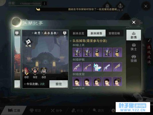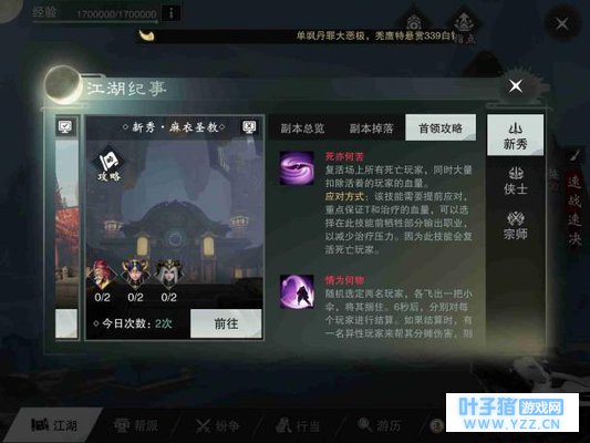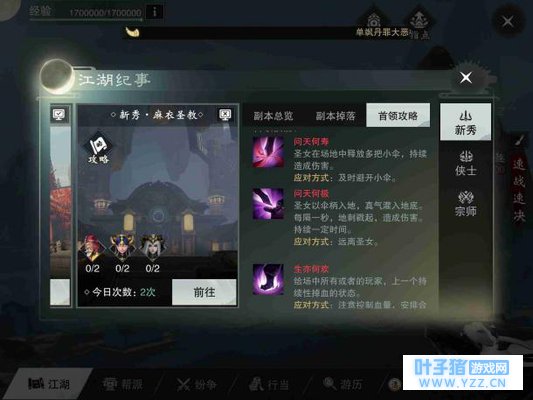 定罪 BOSS随机选定一名玩家,将其定身,然后举剑蓄力,被控住的玩家脚下会出现一个红色圈,薛宝宝会跳起斩向红色区域,这个时候应该快速使用解控技能躲避,也可以有其他玩家也站到红色圆圈中帮被叫到名字的玩家分摊伤害。 宝宝不开心 BOSS原地跺脚,将在地面上的玩家定身,3秒后薛宝宝大跳,狠狠的坐在地上,范围内的玩家都会吃到大量的伤害并且被击倒,看到薛宝宝使用这个技能就要原地轻功起跳,掌握好节奏,就可以完美的躲开这个技能,薛宝宝大跳完后会在地上休息一下,可以抓紧这个时机输出。 饮血刃 BOSS在场中放出一块红色的血雾,每位玩家脚下都会出现一个红色的圈,圈在3秒后会爆开造成伤害,这个时候要各自分散站位,避免受到叠加伤害。 幻影斩 薛宝宝的阔剑变为细剑,薛宝宝展开瞬移攻势,对在场的每位玩家都斩出一剑,这的技能只能硬抗,还好伤害不是很高。 宝宝生气了 薛宝宝在地上缩成一个球,向随机一个玩家滚过去,这个时候其他玩家可以阻止BOSS的技能,将其打断,BOSS就眩晕。 新秀·麻衣圣教 终于到了本篇文章的重头戏,这也是目前让萌新玩家最欲仙欲死的副本,接下来我会详细的讲解这个副本要注意的地方。