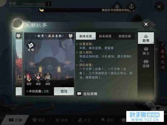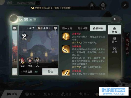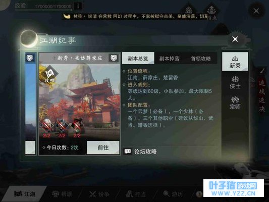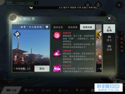 先说下这个副本的阵容搭配,这个副本要求队伍中一定要有2男2女的玩家,这是因为3号最终BOSS的技能会秒杀不是这个阵容的玩家,这是BOSS介绍中说的,但是小编多次通过这个副本发现这一点并不重要,这个技能是可以硬抗过去的,所以不要太纠结什么2男2女的搭配。上面说这个副本要一个云梦,一个少林,其他都行,不全对,现在最合适的阵容搭配是两个云梦,其他随意,武当输出位优先。在修为还不到6000+的时候,两个云梦是必须的。