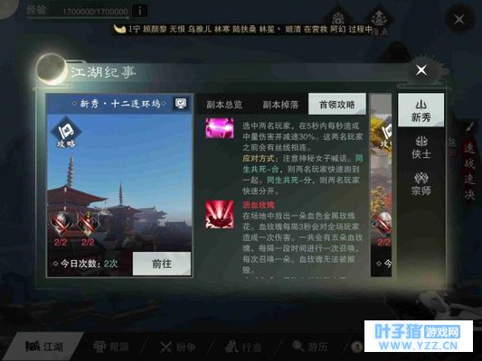 楚留香ios开服过去了半个月的时间,安卓开服也有1周了,相信有很多玩家已经掌握了楚留香手游中“江湖纪事”的玩法,但是每天也可以在世界聊天中看到很多的新手玩家在说:“某某某副本求带”这样的话。当然,不排除有的玩家是会打的,只是修为上有些吃力,但是也不排除有新手玩家还不熟悉玩法,麻衣圣教中的二号BOSS艾青与艾红姐妹也一天又一天的团灭着玩家,这样的事情每天都在重复,希望这篇攻略可以对萌新少侠们有所帮助,各位少侠能早日不靠别人,自强不息! 先说下阵容搭配,云梦是毋庸置疑的第一梯队,不管是“万里听风”这种野外组队任务,还是“烽火雁门关”这种PVP任务,有云梦在场都会舒服很多,云梦不管走到哪都是抢手货毕竟药是很贵的。有了云梦如果能再有个少林的圣僧就能好了,有少林在队中,不管是输出位还是奶妈,都很轻松很多。关于这一点不强求,毕竟少林的玩家很稀少,少林可以用华山来代替一下,华山可以快速破掉BOSS的真气,对于输出会有显著的提高,但是也有可能你的修为很高,华山一直没有办法抢走你的仇恨,那就只好一边风筝一边输出了,武当是最好的输出选择,别的不说,毕竟输出环境要比别的门派舒服很多,暗香目前没有明显要求,但是这个职业的爆发是真的高。 新秀·十二连环坞