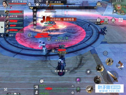 霸天裂地斩 该技能会在武维扬面前造成一个扇形的打击面,扇形区域内的玩家会被击飞,应该看到红色预警区域就快速使用翻滚离开该区域。 破天四面斩 武维扬会一次性向四面扔出4把旋转的飞轮,飞轮旋转就有持续伤害,技能释放前屏幕上会有提示,快速使用轻功远离武维扬。 灭天悬顶刀 每位玩家脚下都会出现一个圆形的红色区域,快速使用轻功离开该区域就可以了。