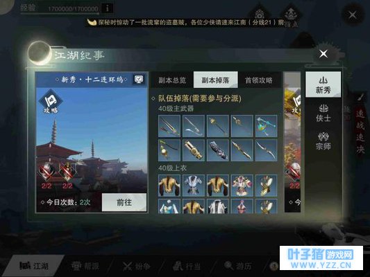 现在的新秀·十二连环坞可能早已不能对玩家们造成什么影响了,每天组上高修的玩家之间就碾压过了。但是最早开荒的玩家对于BOSS的技能掌握肯定要强于新玩家的,况且十二连环坞新秀与侠士BOSS技能都很相像,侠士就不是能有高修玩家带你碾压过去的了,所以熟悉新秀BOSS的技能是十分有必要的。 先看一下副本掉落,该副本主要掉落各职业的40级蓝色装备,目前玩家对这些装备的需求基本没有了,但是小编每日还是会roll点,毕竟分解掉会有一块源石,蚊子再小也是肉嘛,如果什么都没获得那就更好了,会获得天祝点,天祝点可以用来兑换PVE装备的升级材料。