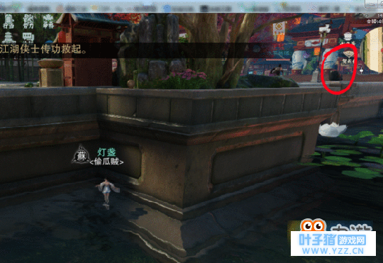 楚留香手游偷瓜技巧: 首先站好位置 这个位置是我们单人偷瓜最好的位置 然后惹怒老板之后就立刻跳到隔壁的河里