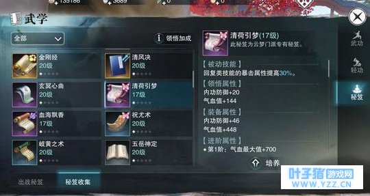 5.秘籍 秘籍对修为的提升并不大,包括进阶属性,但是特效对人物提升不是修为能看出来的;如果只想提升修为,建议少投入,十分耗费资源(所有秘籍都能领悟,有领悟属性,提升较小,但是要使用的话,只能用本门派及通用)。 注意:进阶属性有加真气上限的很重要,是极品属性,还有最小攻击属性一样不错。所有秘籍投入大,修为提升小,前期不建议点高。