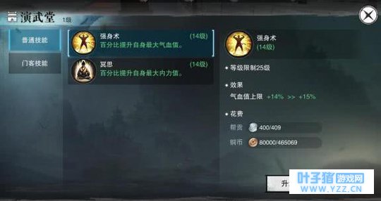 4.帮派技能 帮派技能的升级需要一个好的帮派,其次就是要经常做帮派任务,给与帮派建设的同时也会增长帮贡去升级帮派技能,也会激活门客技能。强身术1级加1%气血,点越高,需求的帮贡和铜币也越大,前期提升比较小,后期考虑经济和帮贡可以适当点几级(帮贡可以便宜买宝石)。建议前期5级,10级左右;冥思1级加1%内力,同等于强身;这边的技能对修为提升也不能算太大,中规中矩,后面血多提升大。