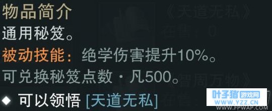 通用秘笈 被动技能:绝学伤害提升10% 领悟属性:气血值+36、外功最大值+20、内功最大值+20 装备属性:气血值+190