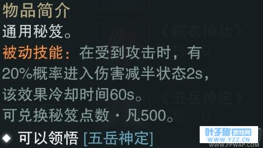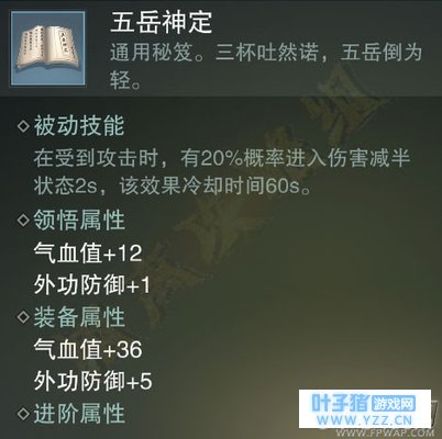 通用秘笈 被动技能:在受到攻击时,有20%概率进入伤害减半状态2S,该效果冷却时间60S 领悟属性:气血值+12、外功防御+1 装备属性:气血值+36、外功防御+5