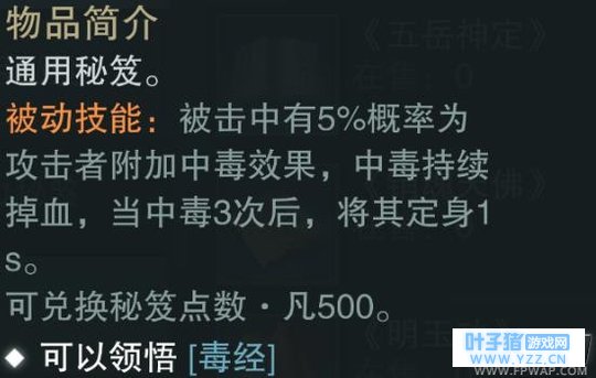 通用秘笈 被动技能:被击中有5%概率为攻击者附加中毒效果,中毒持续掉血,当中毒3次后,将其定身1S。 领悟属性:气血值+36、外功防御+4 装备属性:气血值+108、内功防御+9