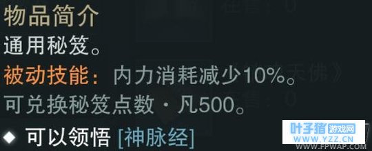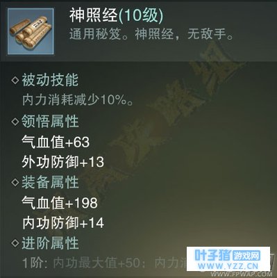 通用秘笈 被动技能:内力消耗减少10% 领悟属性:气血值+63、外功防御+13 装备属性:气血值+198、内功防御+14