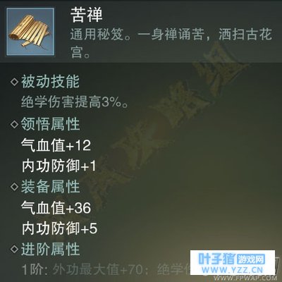通用秘笈 被动技能:绝学伤害提高3% 领悟属性:气血值+12、内功防御+1 装备属性:气血值+36、内功防御+5