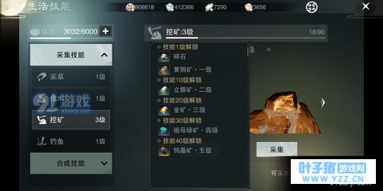 采集:生活技能中的采集、伐木和挖矿可以在世界地图中看到各自的采集点,随着采集技能增加可以采集更多的物品。
