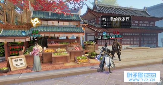 5 "偷瓜"作为《楚留香》时下最热门的活动之一,同样适合团体活动!瓜贩NPC王猛性格有脾气,当顽皮的玩家任性"偷"西瓜,他可是追着玩家打一顿的,机智的玩家发现战术:由同伙吸引NPC注意力,再悄悄抱走西瓜。面对如此精心"偷瓜",瓜贩也只好叹一句:什么仇什么怨啊……