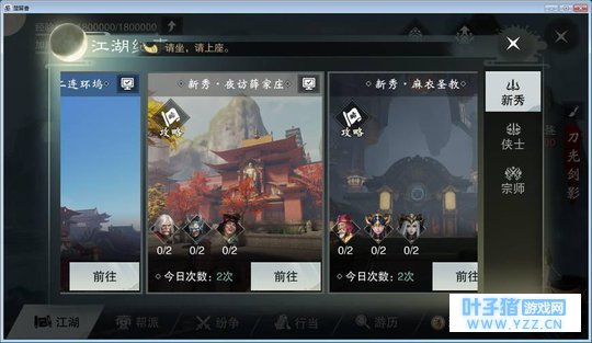 这里要重点说下副本问题,因为整个游戏目前就3个副本而已,如下图所示,每个副本都有新秀、侠士和宗师三个级别。其中麻衣要85级可以开启,而小编比较懒,所以通常都是直接发布悬赏解决的。这样一来游戏的乐趣就更低了,没有新副本可以打,任务什么的也没有,下个主线要160级才能开启,按照现在的速度还要很久才能达到。